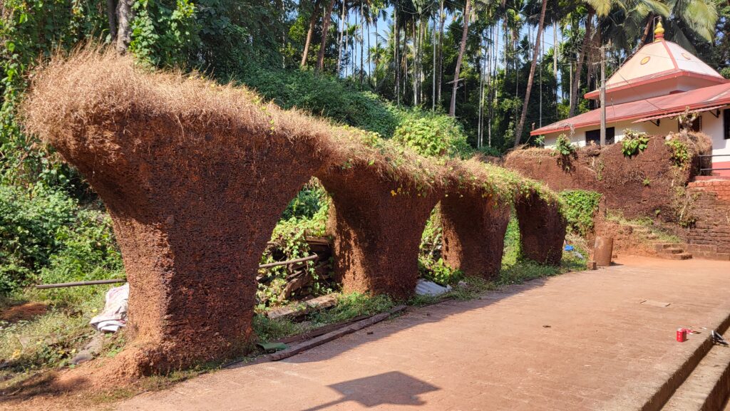 One of the most striking features of the temple is the exquisite Kaavi artwork adorning the walls, pillars, and arches. Created using natural pigments and traditional techniques, these intricate designs reflect Goa’s rich artistic heritage and add a distinct charm to the sacred space.